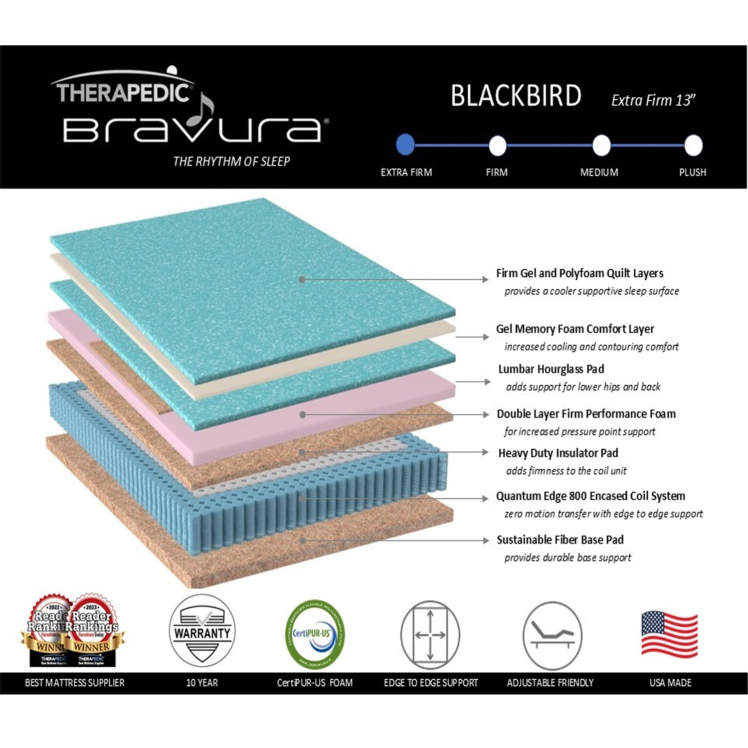 Home / Bedroom & Mattresses / Bravura Blackbird Extra Firm Bravura Blackbird Extra Firm Request a Quote SKU: Bravura Blackbird Extra Firm Categories: Bedroom & Mattresses, Mattresses Brand: Therapedic Description Description Available in: Twin Full Queen King Thickness: 13″