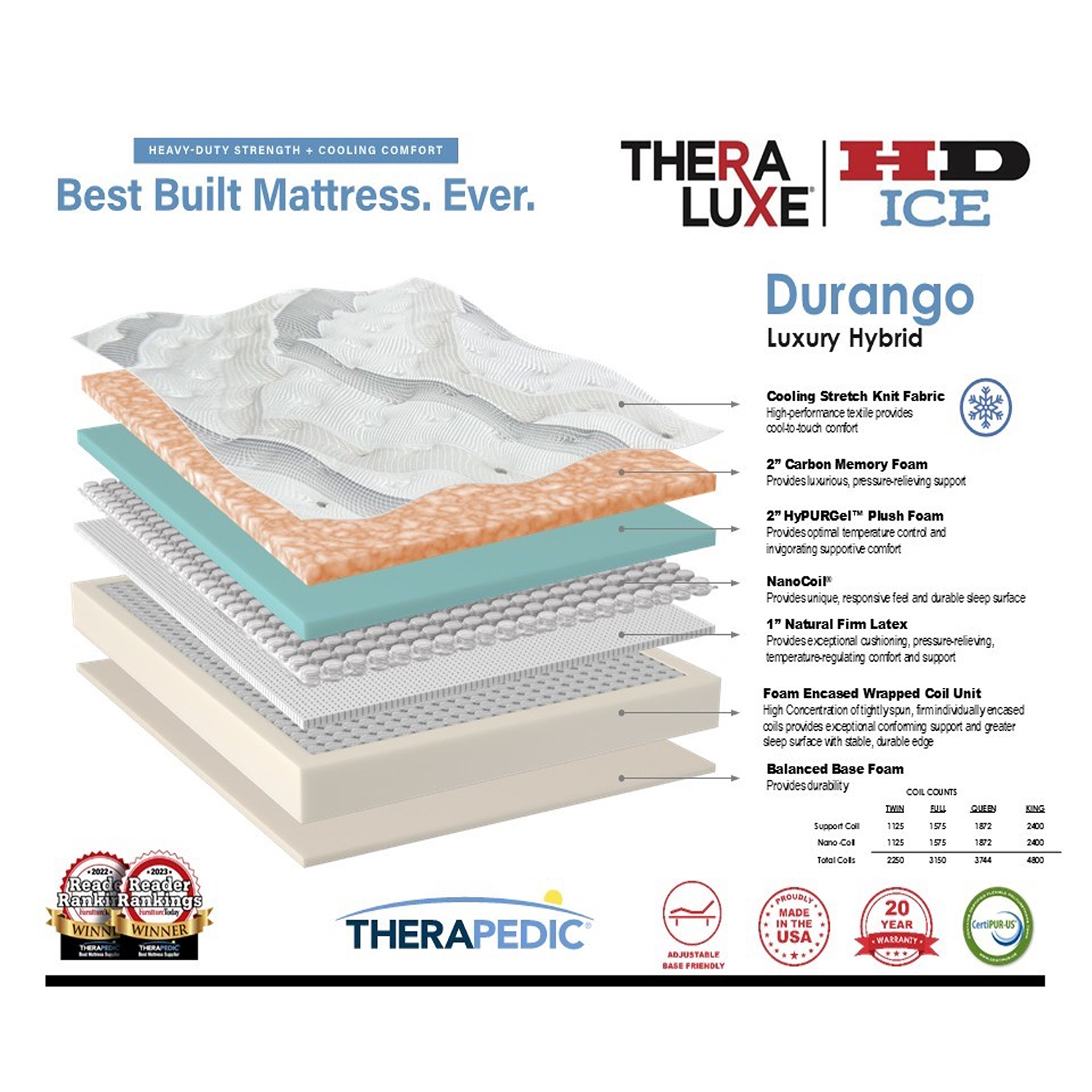Home / Bedroom & Mattresses / TheraLuxe HD Durango Luxury Plush Hybrid TheraLuxe HD Durango Luxury Plush Hybrid Request a Quote SKU: TL HD DURANGO MEDIUM Categories: Bedroom & Mattresses, Mattresses Brand: Therapedic Description Description Available in: Twin Full Queen King Thickness: 15″